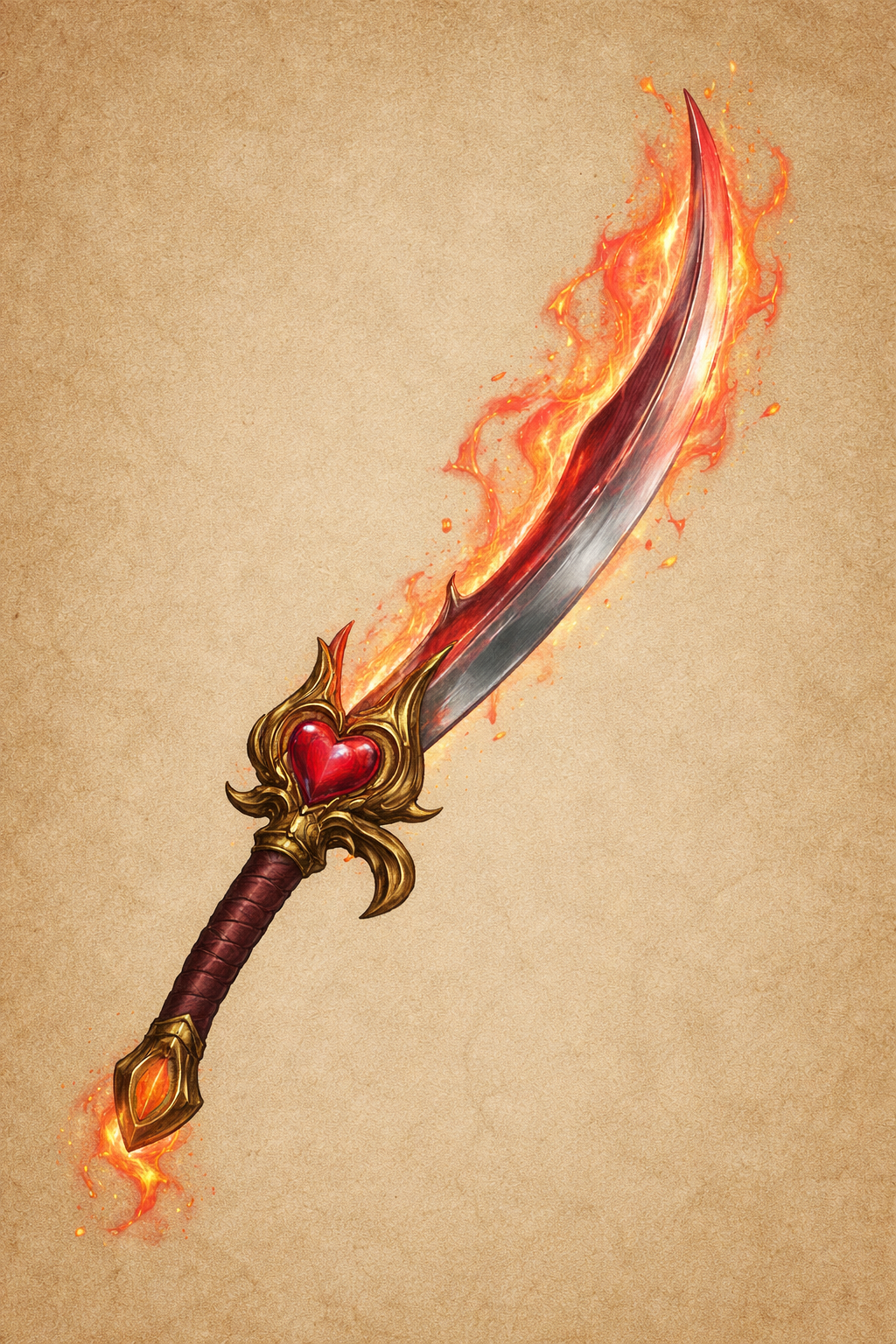 Heartflare Scimitar Weapon (scimitar), Rare (requires attunement)Damage: 1d6 slashingProperties: Finesse, LightWeight: 3 lb. Item Description The Heartflare Scimitar is a gracefully curved blade of polished steel, warm to the touch. Veins of ember-red light pulse faintly beneath its surface, brightening in response to strong emotion. Set into the guard is a heart-shaped ruby that...